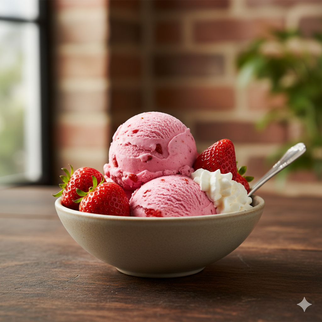 Cremoso helado con el sabor dulce y ligeramente ácido de fresas frescas, perfecto para los amantes de las frutas.